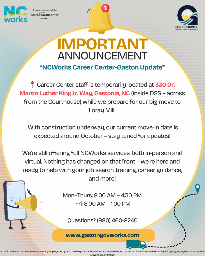 For NCWorks services during the transition to the new location, customers can contact Career Center staff at (980) 460‑8240 or visit the temporary location at DSS – 330 Dr. Martin Luther King Jr. Way, Gastonia, NC. The Center is open Monday through Thursday from 8:00 a.m. to 4:30 p.m., and Friday from 8:00 a.m. to 1:00 p.m.