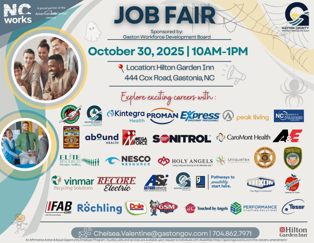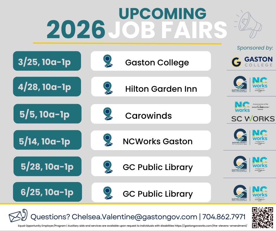 The NCWorks Career Center- Gaston offers employment services to both individual Job Seekers, as well as Employers. Individuals can obtain assistance with Resumé Preparation, Career Development and specific skills training. We host Job Fairs, as well as being able to direct you to potential employers. Employers utilize these locations for Job Fairs, Interview sites, and as a place to conduct skills training.